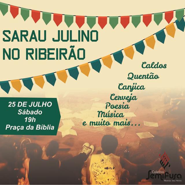 A edição do mês de julho do tradicional Sarau no Ribeirão será realizado com a temática de festa julina. Aproveitando a data, o Coletivo Semifusa está propondo um ambiente agradável para o período, com caldos, quentão, canjica, e cerveja. A poesia e música é presença garantida, e todos podem participar recitando suas poesias ou cantando músicas. O Sarau no Ribeirão especial de festa julina acontece neste sábado (25), a partir das 19h, na Praça da Bíblia, próximo ao Hospital São Judas Tadeu, em Ribeirão das Neves.