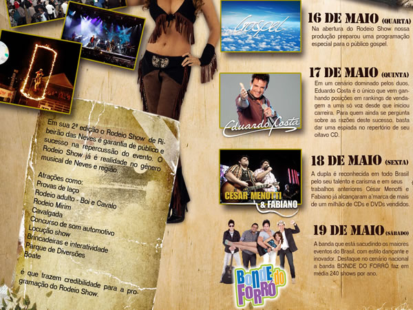 A organização do II Rodeio Show de Ribeirão das Neves confirmou mais duas atrações do evento que acontecerá do dia 16 a 20 de maio. Na sexta-feira (18), terceiro dia de shows, 'César Menotti e Fabiano' farão a apresentação principal e, no sábado (19), o 'Bonde do Forró' ficará encarregado de animar a festa.