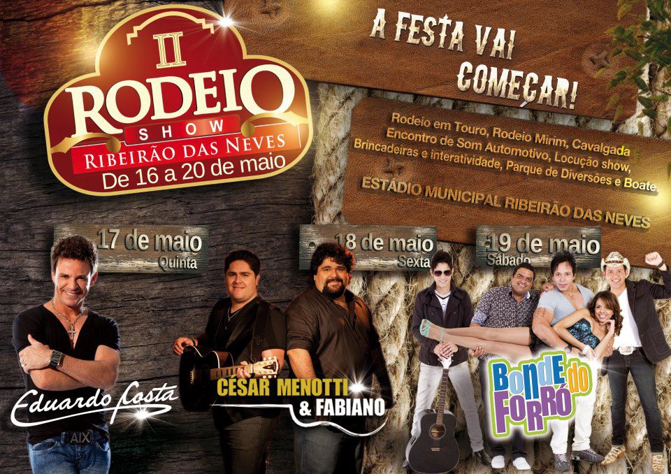 A organização do II Rodeio Show de Ribeirão das Neves começou a vender, nesta sexta-feira (30), os ingressos para o evento, que acontece de 16 a 20 de Maio, no Estádio Municipal, com presenças confirmadas de 'Eduardo Costa', 'Cesár Menotti & Fabiano' e 'Bonde do Forró".