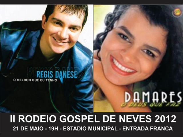 Uma coletiva de imprensa da Golminas, empresa organizadora do II Rodeio Show, realizada nesta terça-feira (17) no 40º Batalhão de Polícia Militar, em Ribeirão das Neves, divulgou os artistas que se apresentarão no Rodeio Gospel. Regis Danese e Damares marcarão presença na festa na segunda-feira, 21 de Maio, no Estádio Municipal, com entrada franca.