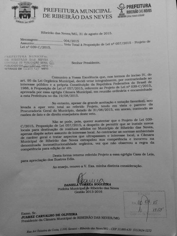 A prefeita Daniela Corrêa (PT) enviou, nesta quarta-feira (2), o veto integral ao Projeto de Lei nº 039-C/2015 para a Câmara Municipal, justificando o ator por contrariedade ao interesse público e à própia Constituição Federal de 1988.