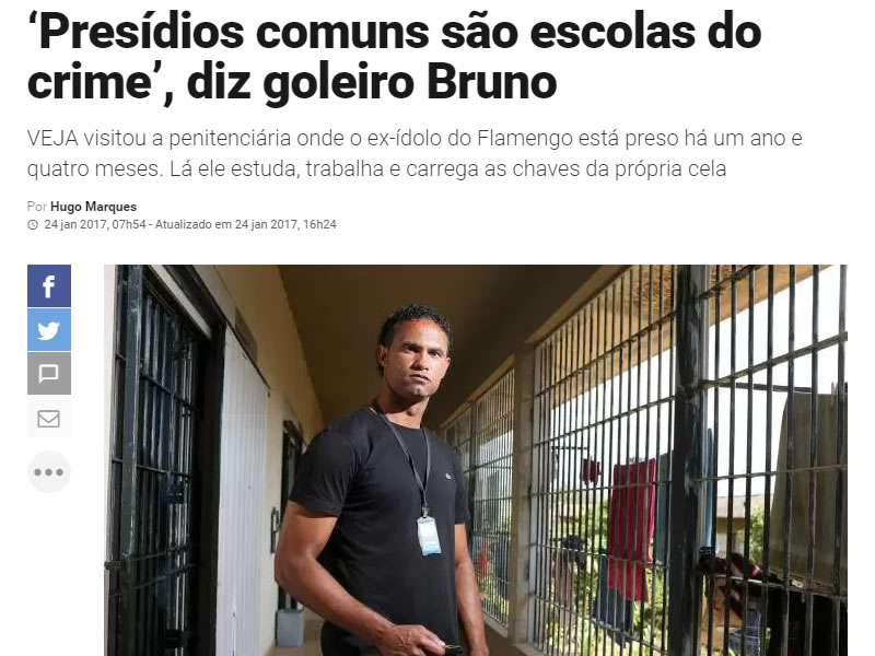 Preso desde julho de 2010, o ex-goleiro do Flamengo Bruno já passou por duas das maiores penitenciárias do país. Há um ano e quatro meses, ele foi transferido para um presídio diferente, em Santa Luzia.