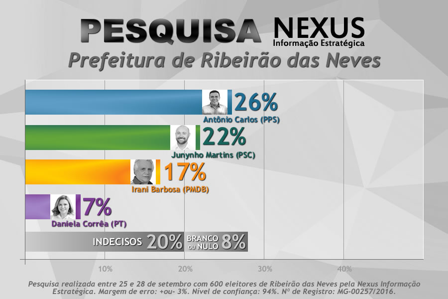 Uma pesquisa realizada pela Nexus Informações Estratégicas, publicada nesta sexta-feira (30), coloca o cantor e empresário Antônio Carlos (PPS) à frente dos adversários na disputa pela Prefeitura de Ribeirão das Neves nas eleições em 2 de outubro.