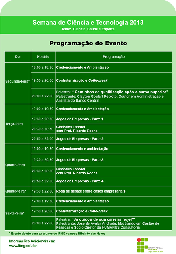 Além disso, a comunidade acadêmica do IFMG e seus ex-alunos contarão com ginásticas laborais, jogos e debates empresariais. Para o fechamento do evento, na sexta-feira (11), às 20hs, ocorrerá a palestra "Já cuidou de sua carreira hoje?", com o mestrando em Gestão de Pessoas e Sócio-Diretor da Humanus Consultoria, João de Avelar Andrade.