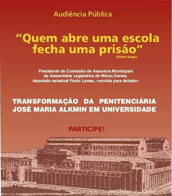 A Comissão de Assuntos Municipais e Regionalização da Assembleia Legislativa de Minas Gerais (ALMG) realiza, na próxima terça-feira (22), às 15h30, audiência pública para debater a contrapartida do Estado aos municípios que abrigam unidades penitenciárias e a conversão da Penitenciária José Maria Alkimim, em Ribeirão das Neves, em uma unidade educacional da Universidade do Estados de Minas Gerais (UEMG).