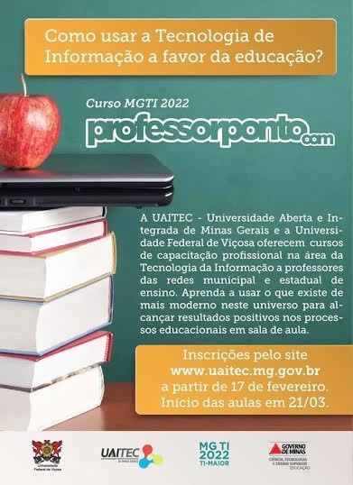 A Universidade Aberta e Integrada de Minas Gerais (Uaitec) e a Universidade Federal de Viçosa (UFV) estão com inscrições abertas para novos cursos na área de Tecnologia da Informação voltados para professores das redes municipal e estadual de ensino denominado projeto ProfessorPontoCom.