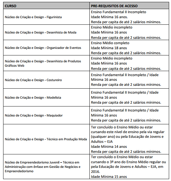 Os cursos são direcionados a jovens com idade entre 14 e 24 anos, que sejam estudantes da rede pública de ensino fundamental e ensino médio de Belo Horizonte e Região Metropolitana, ou que sejam egressos formados no ensino médio da rede pública que residem nessa mesma região. Confira as opções e pré-requisitos de acesso: