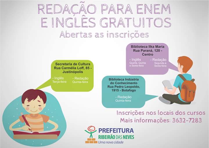 A Secretaria de Cultura de Ribeirão das Neves está com inscrições abertas para cursos de redação para o Enem e de inglês. Em 2016, a grande novidade é que o curso de língua estrangeira passa a ser disponibilizado também para moradores da regiãõ de Justinópolis.