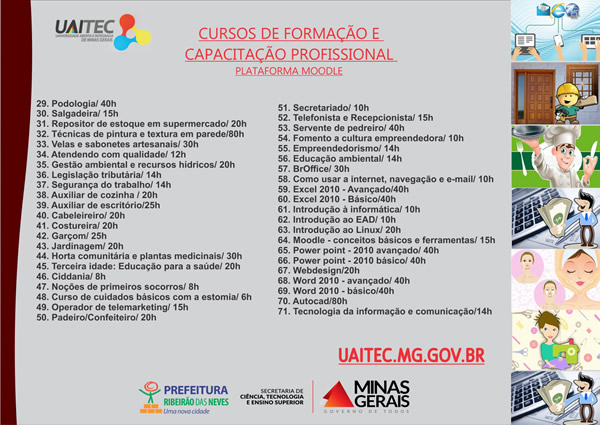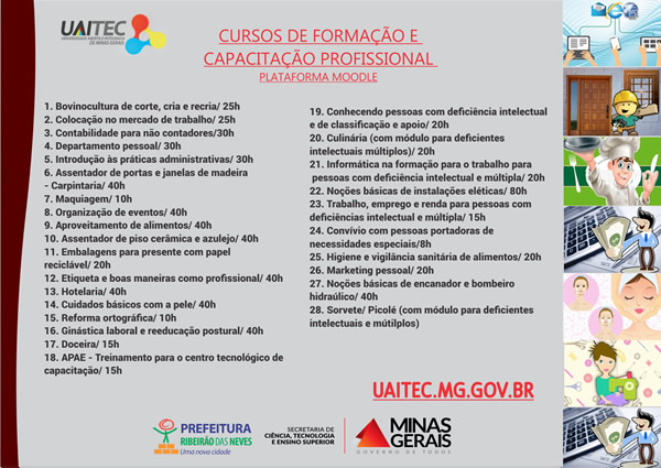Para participar, bastar acessar o site www.uaitec.mg.gov.br e efetuar seu cadastro. Veja abaixo a lista de cursos disponíveis na plataforma.