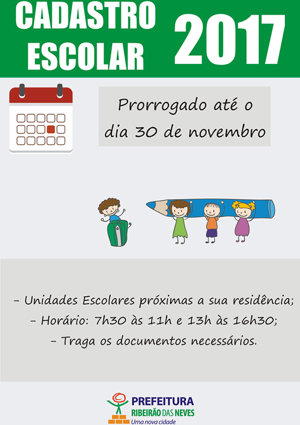 A Prefeitura de Ribeirão das Neves prorrogou, até a próxima quarta-feira (30), as inscrições para as creches municipais para ano letivo de 2017. É necessário que o responsável pela criança - maior de 18 anos - vá até a unidade escolar mais próxima da residência e preencha uma ficha de inscrição, além de levar o original e uma cópia de alguns documentos, especialmente a certidão de nascimento original.