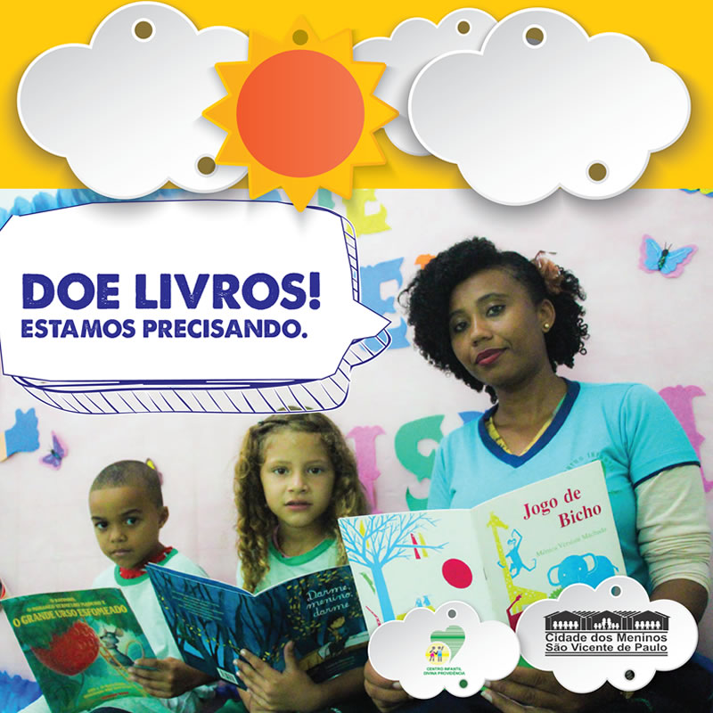 O Centro Infantil Divina Providência e a Cidade dos Meninos São Vicente de Paulo estão em busca de livros para compor suas bibliotecas. As obras de maior necessidade são principalmente de caráter literário com intuito de incentivar cada vez mais a leitura dos jovens.