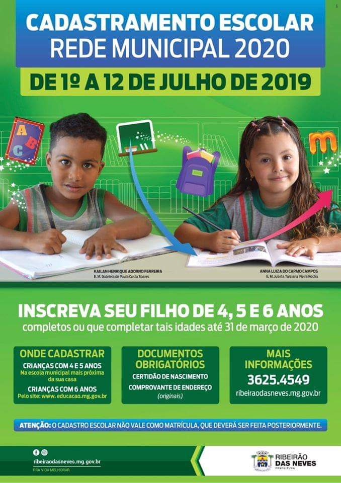 O Cadastramento Escolar 2020 para todos os candidatos que desejam ingressar no ensino fundamental de escolas públicas do município de Ribeirão das Neves e do Estado de Minas Gerais começa nesta segunda-feira (1º) e vai até o dia 12 de julho. Em ambas as redes podem ser inscritos crianças com seis anos completos ou que vão completar essa idade até 31 de março de 2020.