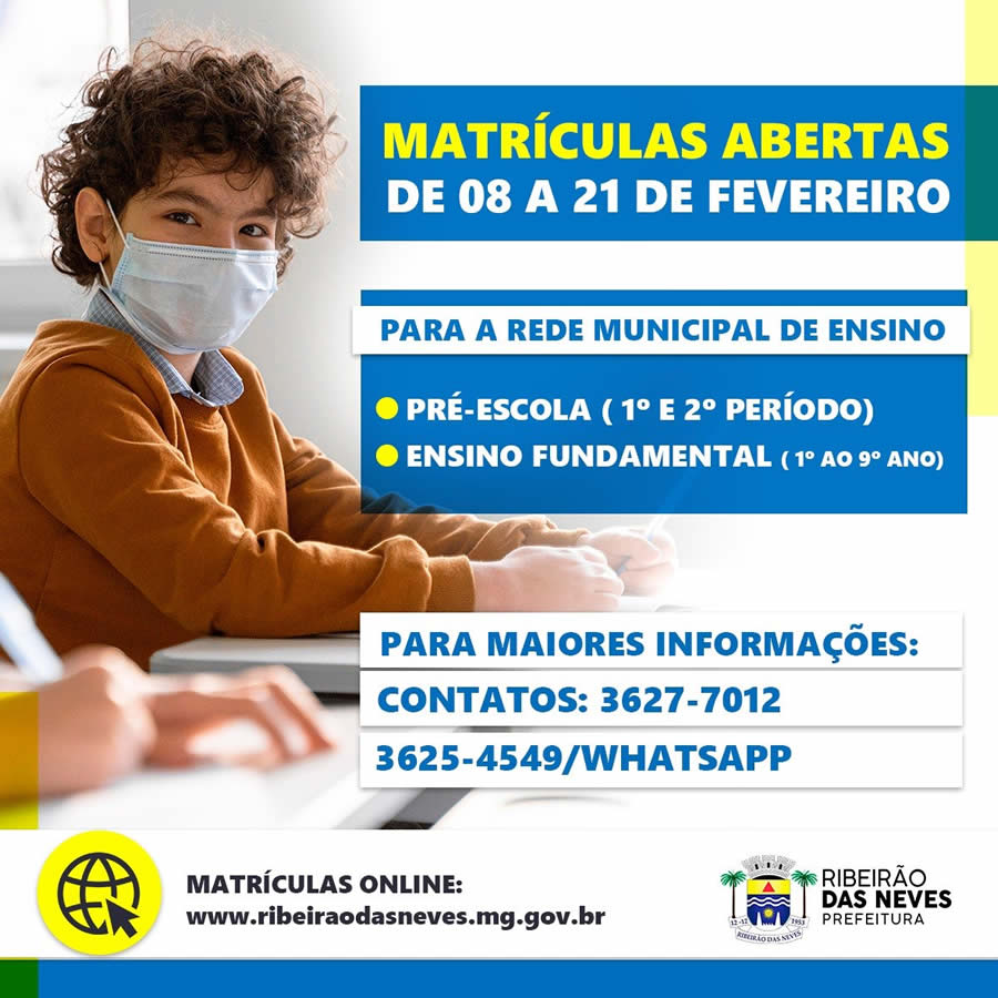 A partir da próxima segunda-feira (8), a Prefeitura de Ribeirão das Neves abre as inscrições para a pré-escola (1º e 2º período) e o ensino fundamental (1º ao 9º ano) na rede municipal de ensino, que vão até o dia 21 de fevereiro pelo site wwww.ribeiraodasneves.mg.gov.br.