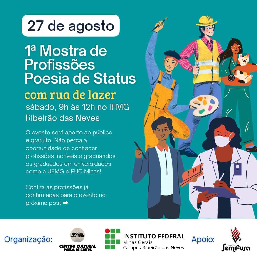 O Instituto Federal de Educação, Ciência e Tecnologia de Minas Gerais (IFMG) e o Centro Cultural Poesia de Status, realizam, neste sábado (27) a 1ª Mostra de Profissões. O evento acontece de 9h às 12h, no campus Ribeirão das Neves.