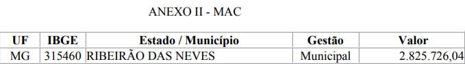 O Ministério da Saúde liberou, nessa quinta-feira (9), mais R$ 4 bilhões extras para estados e municípios reforçarem suas ações de combate ao Coronavírus. Desse montante, Ribeirão das Neves recebe 2.825.726,04 como fôlego financeiro em caixa para aquisição de materiais e insumos, abertura de leitos, além do custeio de profissionais de saúde, ações e procedimentos, conforme a necessidade local, para enfrentamento específico ao COVID-19.