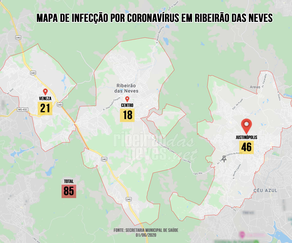 O levantamento da Secretaria Municipal de Saúde (SMS) da última sexta-feira (29), último do mês de maio, aponta que Ribeirão das Neves tem 85 casos confirmados de infecção por Coronavírus. A pedido do RibeiraoDasNeves.net, a pasta fez um levantamento para saber onde estão distribuídos os diagnósticos que resultaram em testagem positiva para a Covid-19.