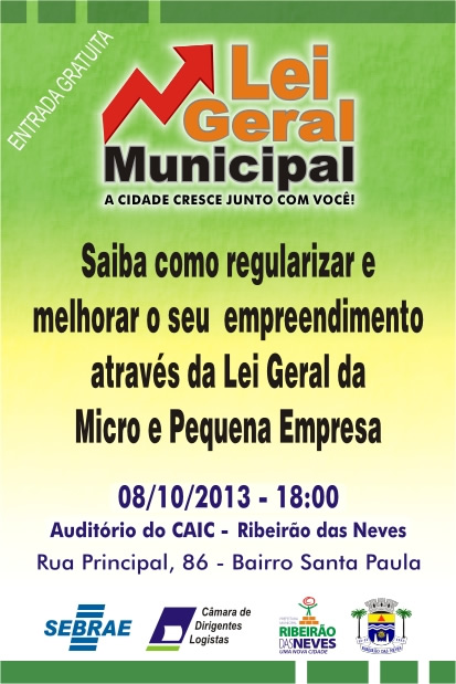 O Sebrae, a Câmara de Dirigentes Logistas (CDL) e a Prefeitura de Ribeirão das Neves promovem, na próxima terça-feira (8), às 18hs, no Auditório do Caic, em Ribeirão das Neves, uma palestra sobre a Lei Geral Municipal, para que os nevenses saibam como regularizar e melhorar o seu empreendimento através da Lei Geral da Micro e Pequena Empresa.
