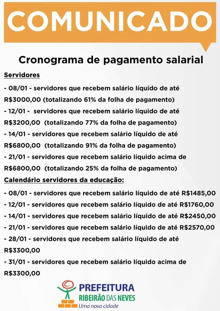 A Prefeitura de Ribeirão das Neves divulgou, nesta semana, um cronograma especial de pagamento do salário referente ao mês de dezembro dos servidores municipais. O escalonamento foi dividido entre o funcionalismo geral e o servidores da educação durante o mês de janeiro.