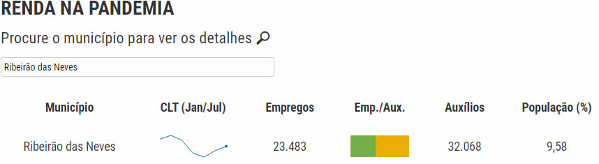 De acordo com as informações obtidas pelo jornal, são ao todo 440 cidades mineiras nesta situação, o que corresponde a 51,6% dos 853 municípios. Em Ribeirão das Neves são 23.483 trabalhadores registrados via CLT de janeiro a julho de 2020, frente a 32.068 auxílios pagos aos nevenses via auxílio emergencial, correspondente a 9m58% da população nevense.