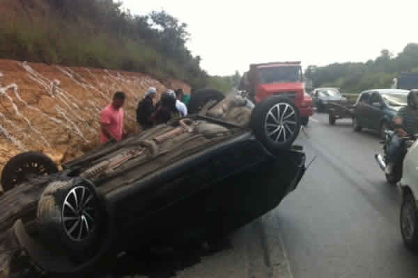 O condutor tentou frear, mas não conseguiu evitar que o acidente acontecesse. Um Volkswagen Golf preto foi atingido com muita força na traseira e acabou capotando na pista. Os dois carros ficaram bastante destruídos.