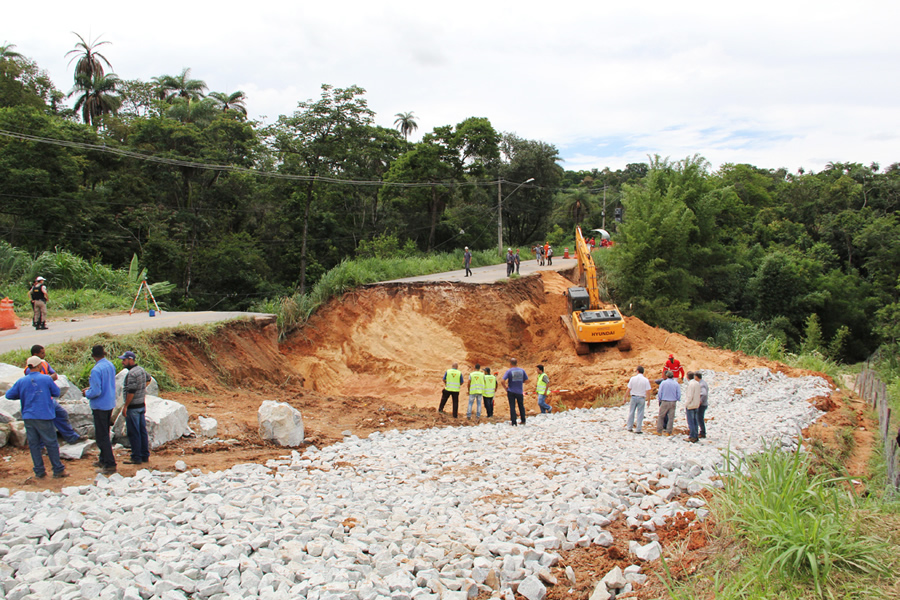 Nessa sexta-feira (16) foi realizado o enrocamento da área (base de pedra para fundação de obra) sobre a qual serão instalados duas linhas de tubos metálicos com 2,80 metros de diâmetro para o escoamento da água pluvial. A etapa seguinte será a recomposição do aterro até o nível da rodovia. Com isso, será restabelecido o tráfego em condições de segurança e sem restrições de carga.