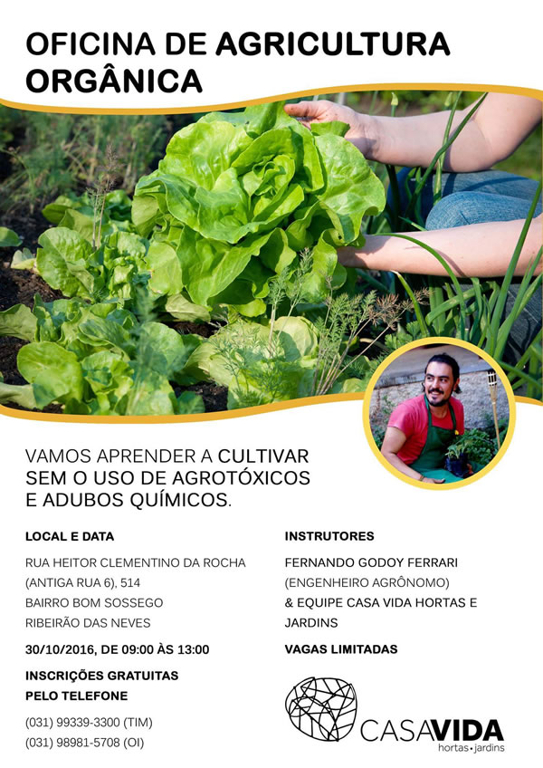 Quem deseja aprender a cultivar sem o uso de agrotóxicos e adubos químicos terá a chance de participar da Oficina de Agricultura Orgânica que acontece no dia 30 de outubro, de 9h às 13h, em Ribeirão das Neves, com o engenheiro agrônomo Fernando Ferrari e a equipe Casa Vida Hortas e Jardins.