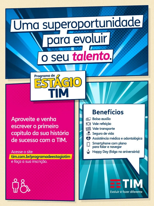 A empresa de telefonia Tim está com inscrições abertas até 11 de setembro para seu Programa de Estágio pelo site www.vagas.com.br. As oportunidades são direcionadas a várias localidades no Brasil, incluindo Belo Horizonte, e podem ter carga horária de 4h e de 6h diárias.