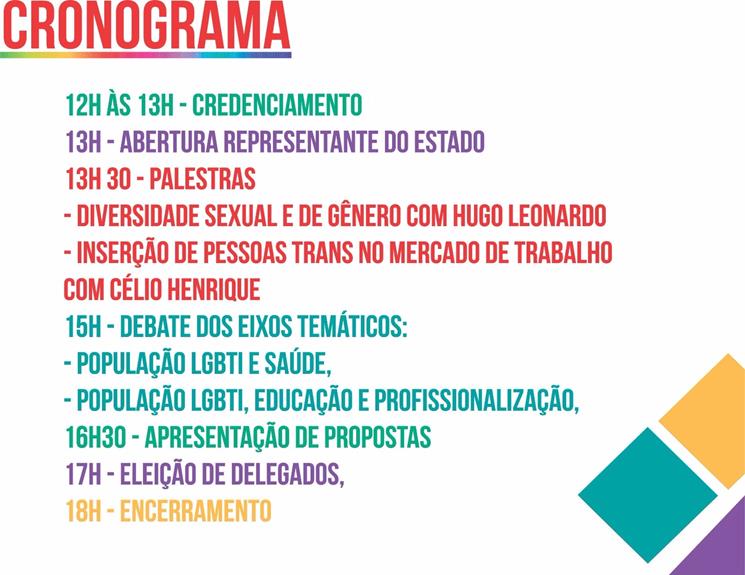 O cronograma do evento prevê um abertura de um representante do Estado, uma palestra sobre diversidade sexual e de gênero e outra sobre inserção de pessoas trans no mercado de trabalho; debates sobre os eixos população LGBTI e saúde, e população LGBTI, educação e profissionalizações. Na parte final será feita apresentação das propostas e eleição de delegados.