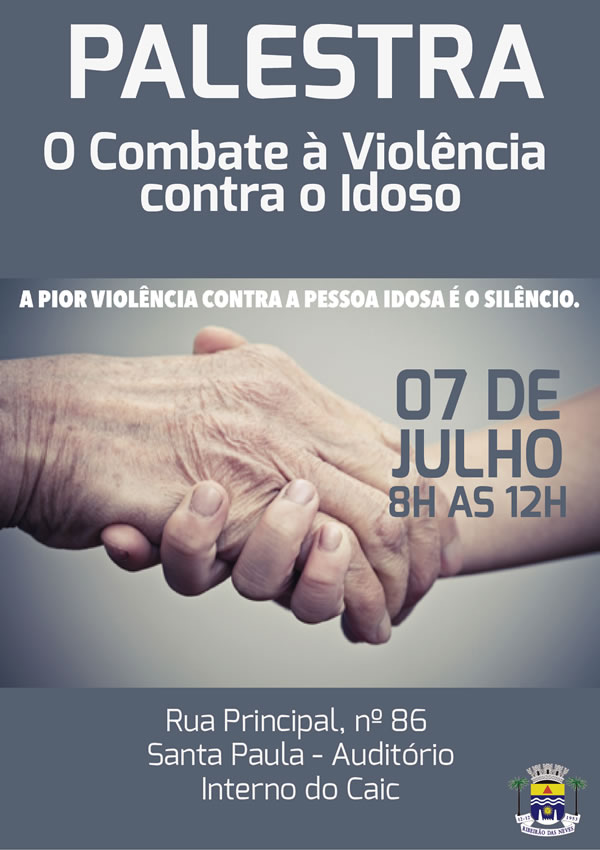 A Prefeitura de Ribeirão das Neves realiza, nesta quinta-feira (7), de 8h às 12h, no Auditório Interno do Caic, a palestra "O combate à violência contra o idoso". O lema da palestra é "a pior violência contra a pessoa idosa é o silêncio". O Caic fica na rua Principal, 86, bairro Santa Paula, em Ribeirão das Neves.