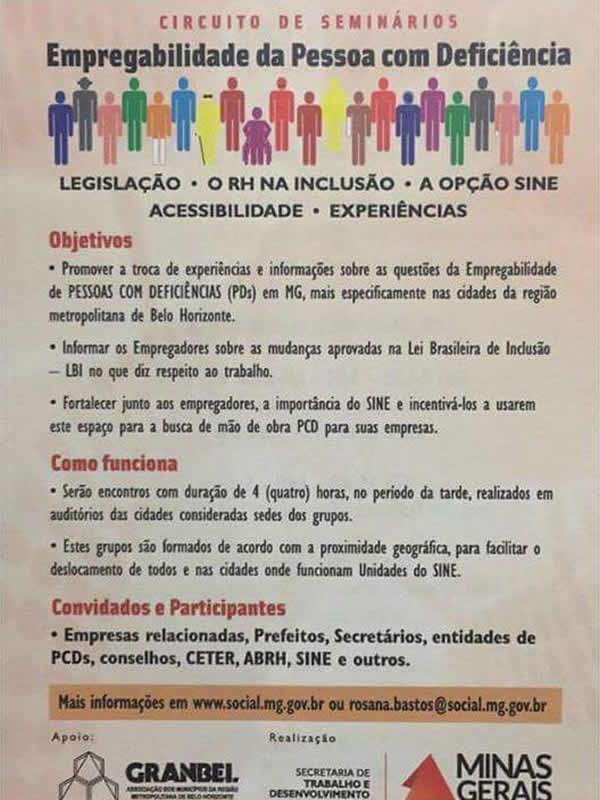 De acordo com a pasta, o objetivo é promover a troca de experiências e informações sobre as questões das pessoas com deficiências nas cidades da Região Metropolitana de Belo Horizonte, além de informar os empregadores sobre mudanças na Lei Brasileira de Inclusão (LBI) e incentivar o uso do Sine na busca de mão de obra PCD.