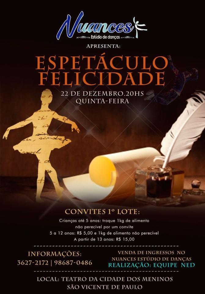 Baseado na canção do Teatro Mágico, o Espetáculo Felicidade vai contar a história de vários personagens suas teorias sobre onde encontrar a felicidade na vida. O evento é promovido pelo Estúdio de Danças Nuances, nesta quinta-feira (22), às 20h, no Teatro da Cidade dos Meninos.