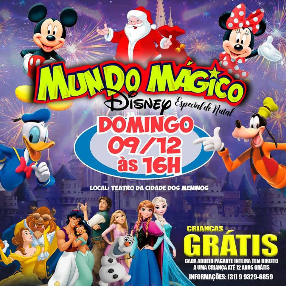 O espetáculo "O Mundo Mágico" faz apresentação única no próximo domingo (9), às 16h, no Teatro da Cidade dos Meninos, em Ribeirão das Neves. Os personagens Mickey, Minnie, Pateta e Pato Donald irão apresentar um musical com muita magia, diversão, encanto e interação com o público.
