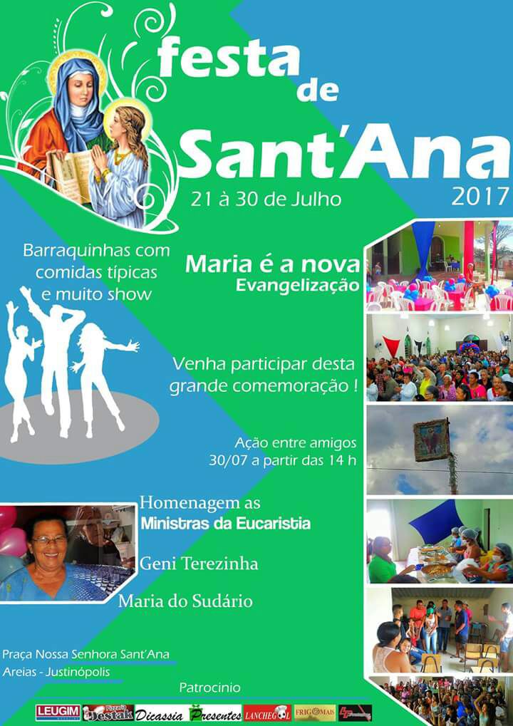 Com o tema "Maria é a nova Evangelização", vem aí mais uma edição da Festa de Sant'Ana, de 21 a de 30 de julho, na Praça Nossa Sant'Ana, em Areias. A programação prevê barraquinhas com comidas típicas e muito show.