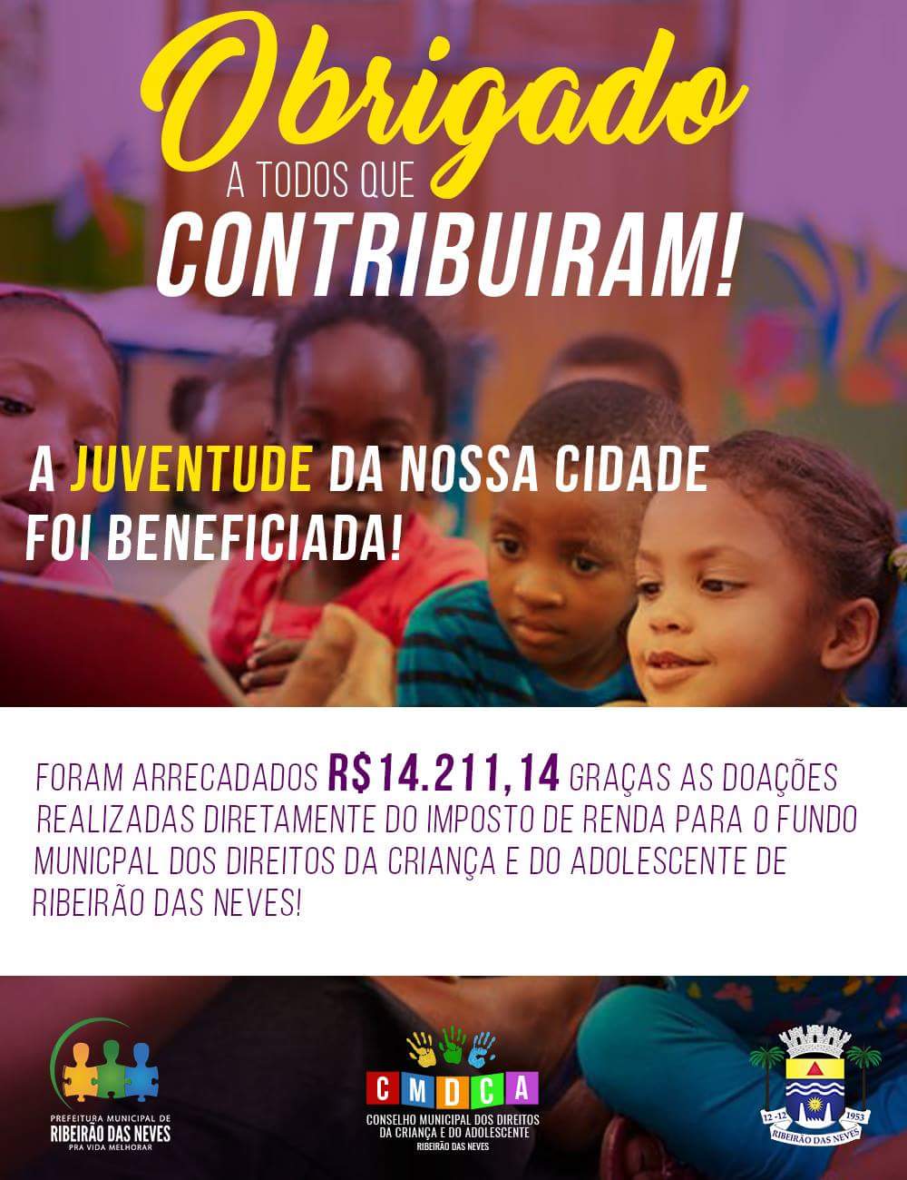 "Foram arrecadados R$ 14.211,14 graças a doações realizadas diretamente do Imposto de Renda para o Fundo Municipal dos Direitos da Criança e do Adolescente de Ribeirão das Neves".