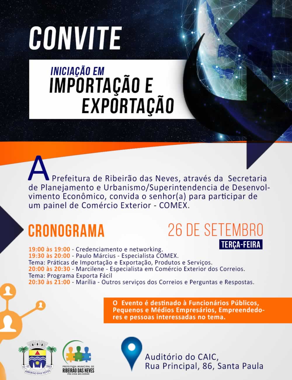 A Secretaria Municipal de Planejamento e Urbanismo está organizando um workshop de iniciação à importação e exportação em Ribeirão das Neves para apresentar aos empresários as fases e os procedimentos de como a importação e exportação podem contribuir para a ampliação de seu mercado e de suas vendas. O evento, que é voltado para funcionários públicos, empresários, empreendedores e interessados nas informações que os levem a tomada de decisão sobre importar ou exportar, acontece na próxima terça-feira (26), a partir das 19h, no auditório do Caic. Informações pelo telefone (31) 3627-1447.