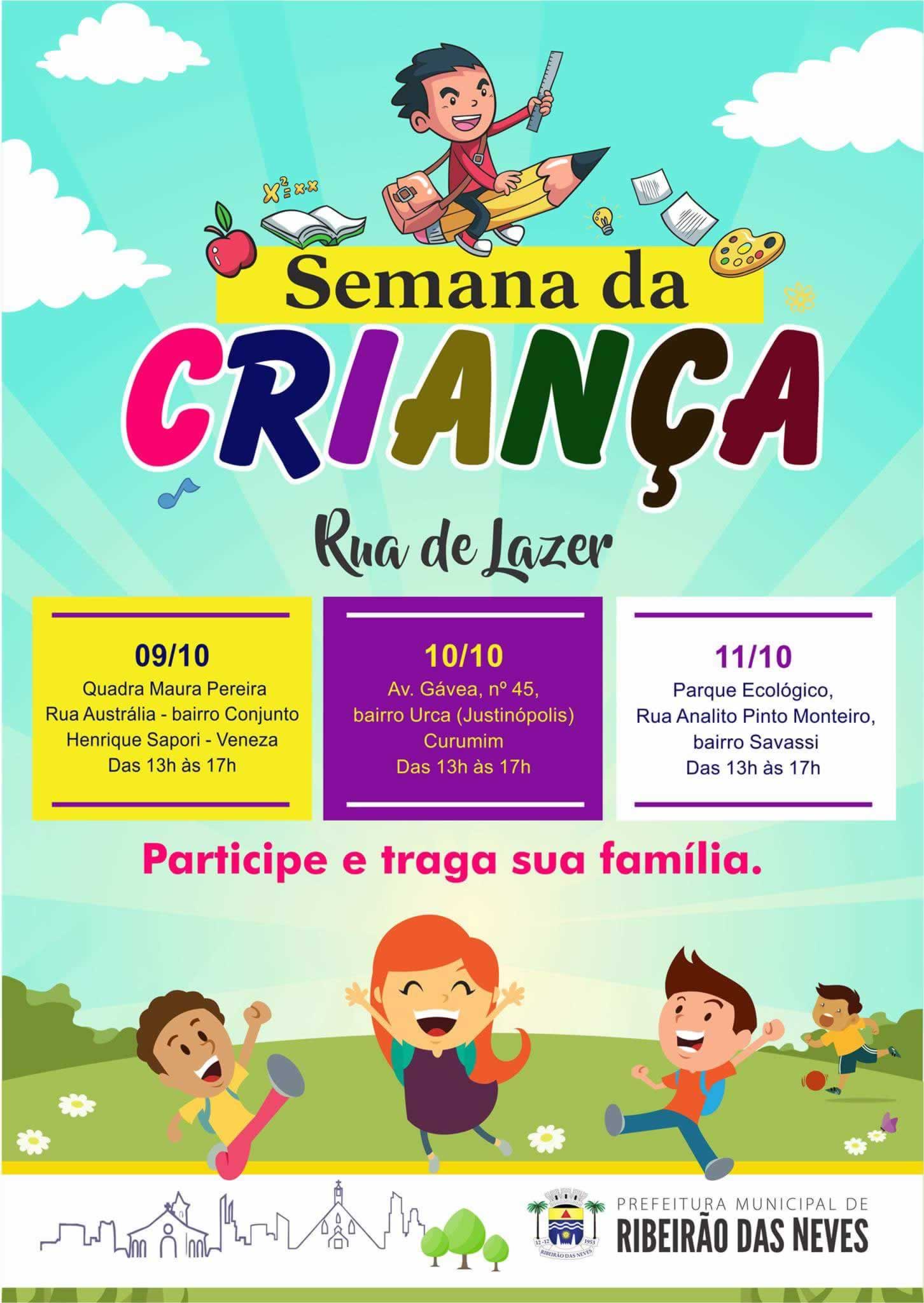A Prefeitura de Ribeirão das Neves terá uma programação especial com rua de lazer na Semana da Criança nas três regionais da cidade. Na segunda-feira (9), na Quadra Maura Pereira, no Veneza; na terça (10), no Curumim, em Justinópolis; e na quarta (11), no Parque Ecológico, sempre de 13h às 17h. Participe e traga sua família.