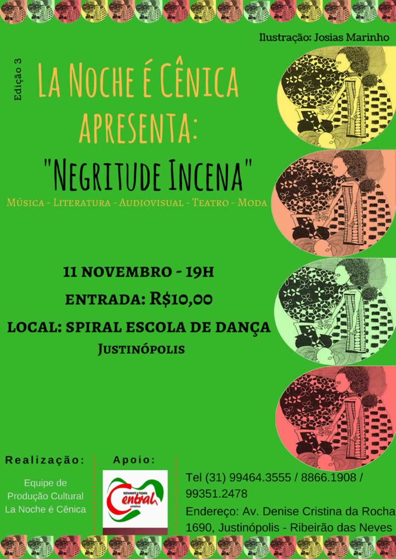 Música, literatura, audiovisual, teatro e moda. A 3ª edição do "La Noche é Cênica - Negritude Incena", que acontece neste sábado (11), às 19h, na Spiral Escola de Dança - Av. Denise Cristina da Rocha, 1.690, em Justinópolis - com ingressos a R$ 10.