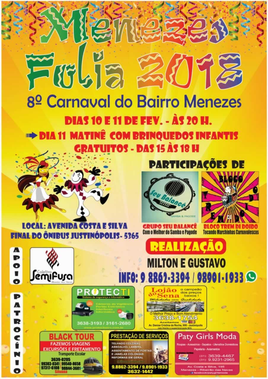 Justinópolis se prepara para mais uma edição do "Menezes Folia", que reúne tradição e promete agitação com musicais, apresentações carnavalescas e matinê infantil, tendo como propósito oferecer aos moradores do bairro Menezes e adjacências o lazer, entretenimento e integração social.