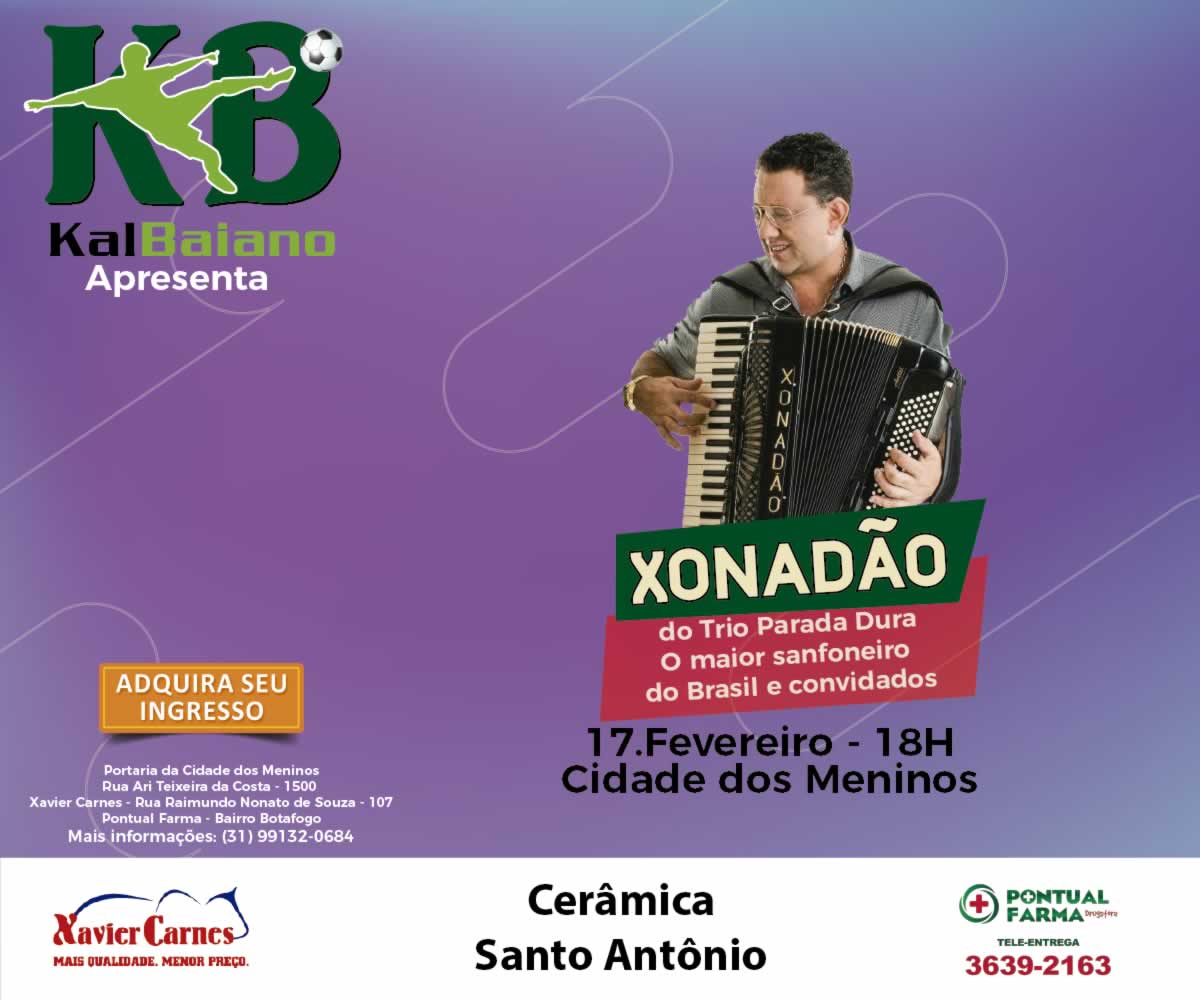 A Cidade dos Meninos recebe apresentação única do sanfoneiro Xonadão, do Trio Parada Dura, e seus convidados no dia 17 de fevereiro, a partir das 20h.