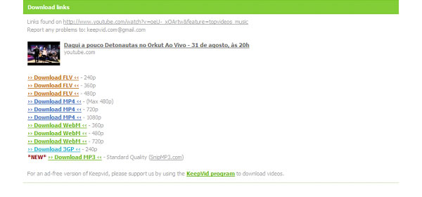 Automaticamente o site ira converter o vídeo e disponibilizar os links para donwloads em vários formatos, como FLV, MP4, 3GP e, a novidade, mp3, caso você queira extrair apenas o áudio de algum vídeo.
