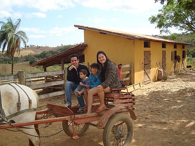 Esta colunista, José Geraldo, João e Lucas em passeio de charrete no Hotel Fazenda Lírio dos Vales. |