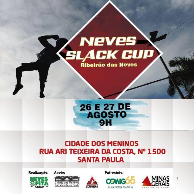 Prepare as fitas, as manobras, segure o fôlego que vem muita adrenalina. Ribeirão das Neves sedia nos dias 26 e 27 de Agosto, o Neves Slack Cup, Campeonato Nacional de Slackline, na Cidade dos Meninos. Atletas do Brasil inteiro e da América do Sul estão confirmados naquela que promete ser a maior competição do esporte no país.