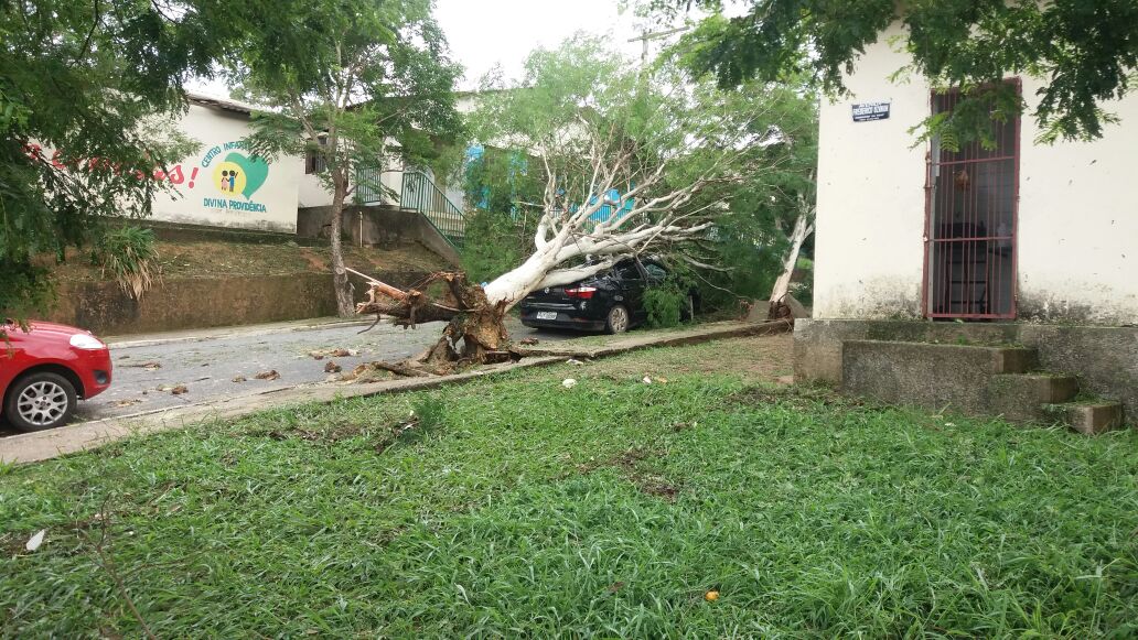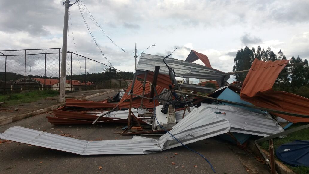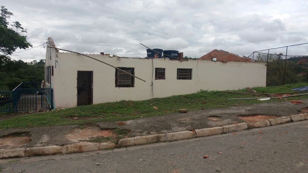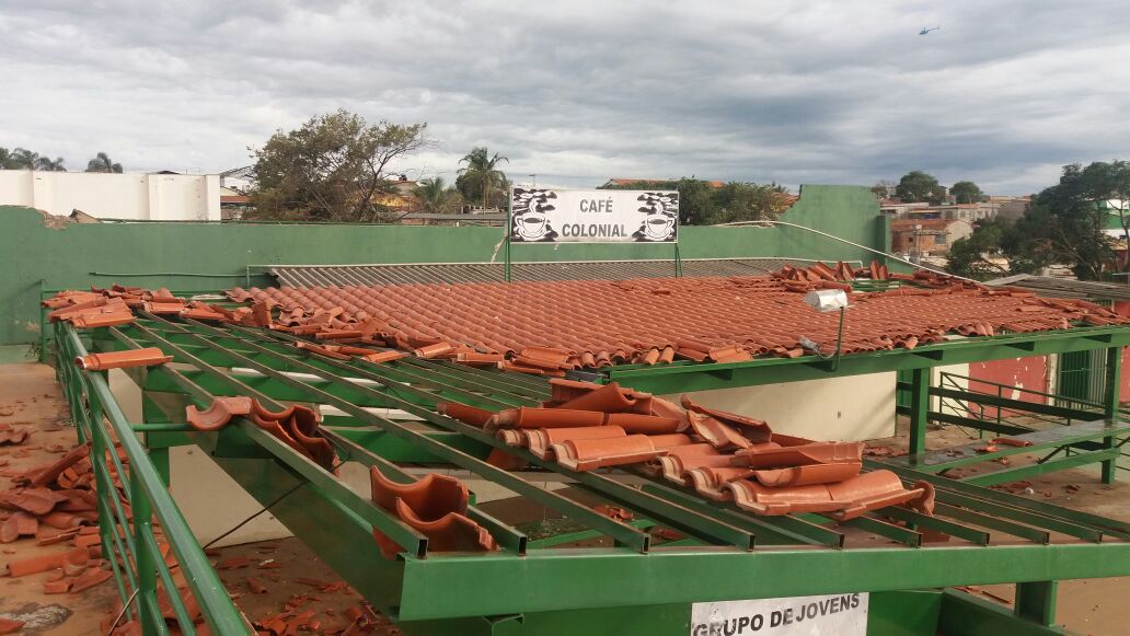 O telhado da quadra da Escola Municipal Maria Veira Barbosa, o Caic, veio abaixo com a força da chuva e do vento. No bairro Santa Marta, o telhado de um Supermercado também não resistiu à pressão e foi levado pelo temporal.