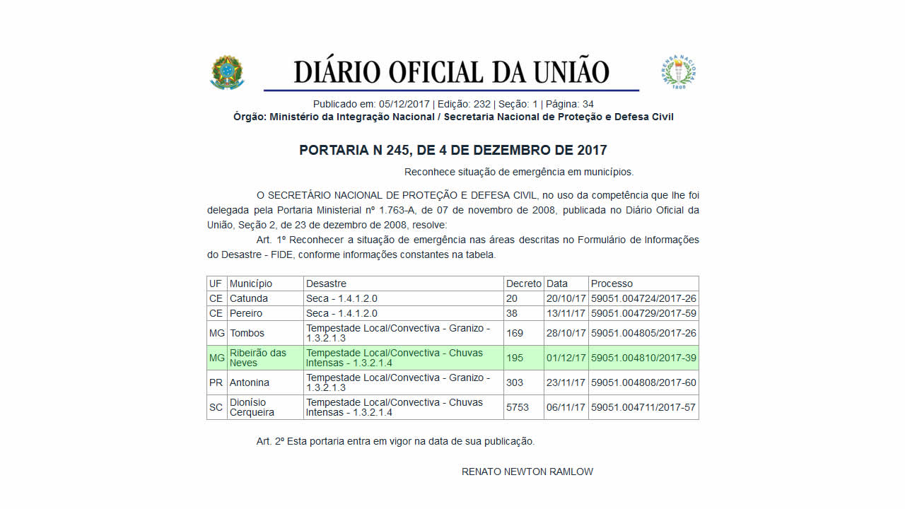 O Ministério da Integração Nacional reconheceu a situação de emergência em Ribeirão das Neves. A portaria foi publicada no Diário Oficial da União (DOU) nesta terça-feira (5).