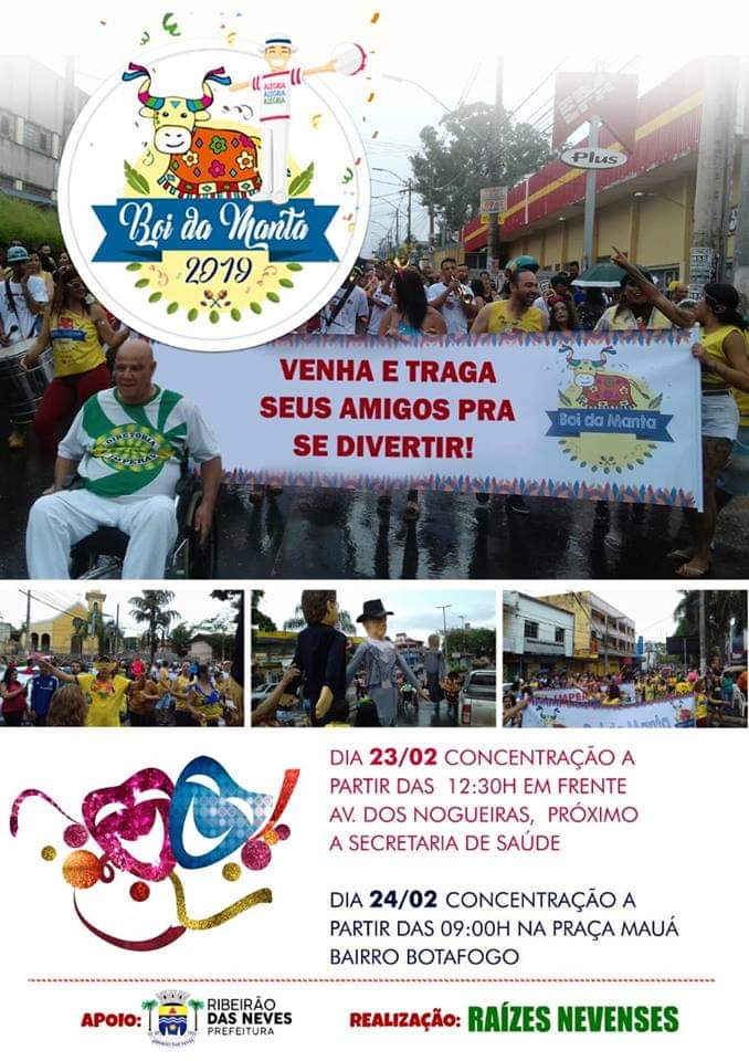 Depois de 18 anos parado, o Boi da Manta de Ribeirão das Neves volta a todo vapor, tendo como porta-voz pessoas empenhadas em trazer alegria e diversão, além de resgatar a criatividade do folião nevense. O boi será "importado" da Associação Cultural Boi da Manta, de Pedro Leopoldo.