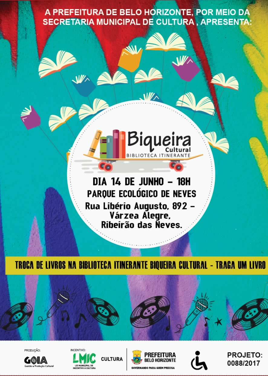 O projeto Biqueira Cultura, uma Biblioteca Itinerante que realiza trocas de livros na Região Metropolitana de Belo Horizonte (RMBH), vai passar por Ribeirão das Neves nesta semana. Na sexta-feira (14), no Parque Ecológico, às 17h, acontece o Sarau da Biqueira Cultural. Às 18h, haverá a exibição do filme "Somos quem somos e nada", no Parque Ecológico (Rua Libério Augusto, 892, Bairro Várzea Alegre).