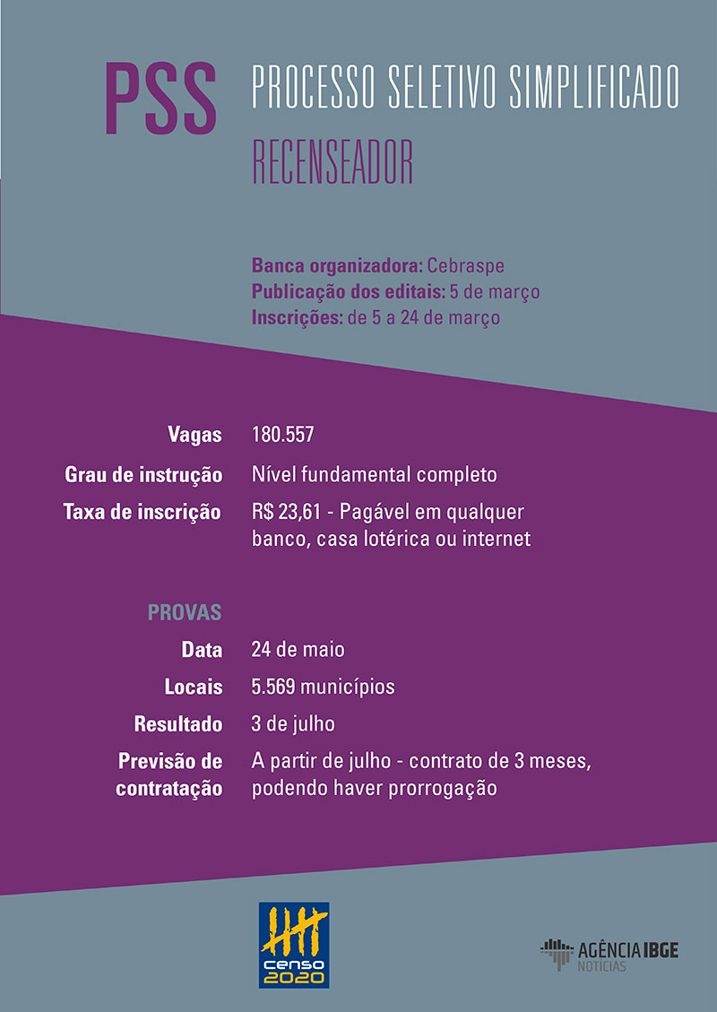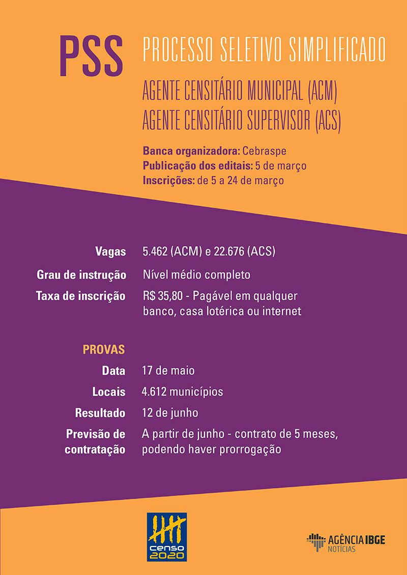O Censo Demográfico 2020 entrará de casa em casa para compor um novo retrato da realidade do Brasil. Para executar esta tarefa, o Instituto Brasileiro de Geografia e Estatística (IBGE) vai contratar temporariamente 208.695 pessoas, por meio de dois editais de Processos Seletivos Simplificados (PSS), lançados nesta quinta-feira (5).