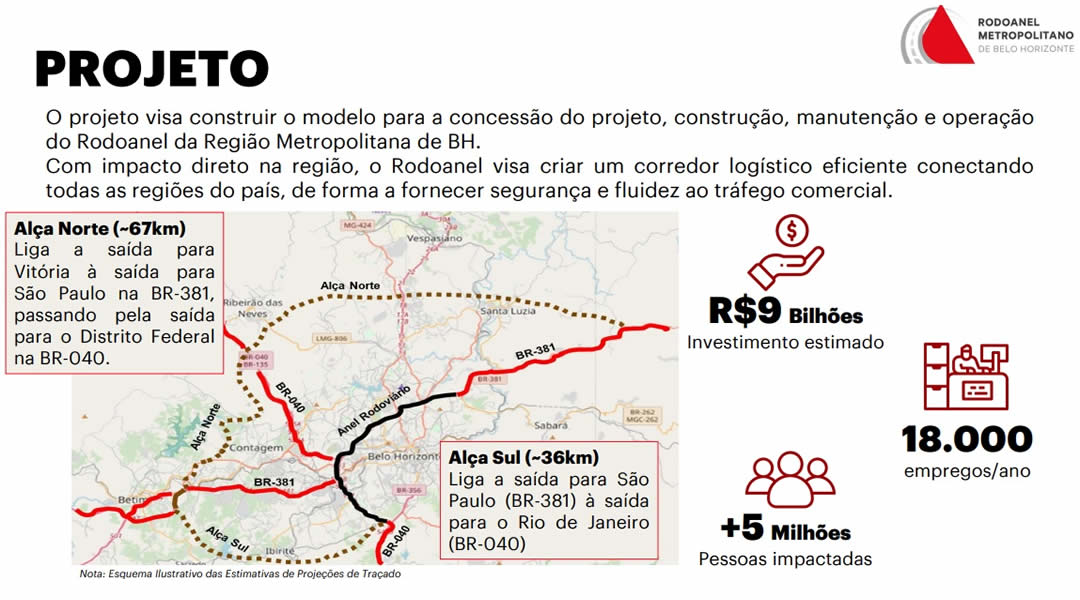 O projeto do Rodoanel da Região Metropolitana de BH é uma parceria-pública-privada (PPP) que prevê a elaboração de projetos, construção e operação da nova rodovia pelo prazo de 30 anos. A obra é apontada pelo governador Romeu Zema (Novo) como principal medida para retirar o trânsito pesado do Anel Rodoviário de BH.
