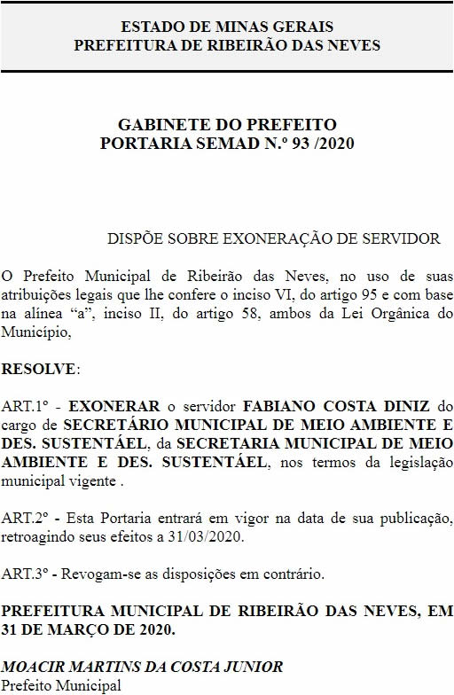 O secretário municipal de Meio Ambiente e Desenvolvimento Sustentável, Fabiano Diniz, foi exonerado do cargo nesta quarta-feira (1º), conforme publicação no Diário Oficial dos Municípios Mineiros (DOMM), menos de um mês após tomar posse com toda pompa e circustância no dia 3 de março.