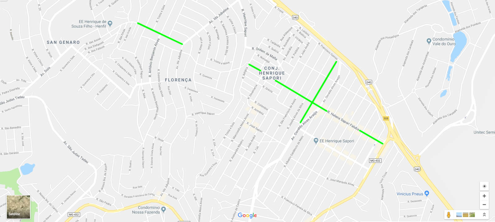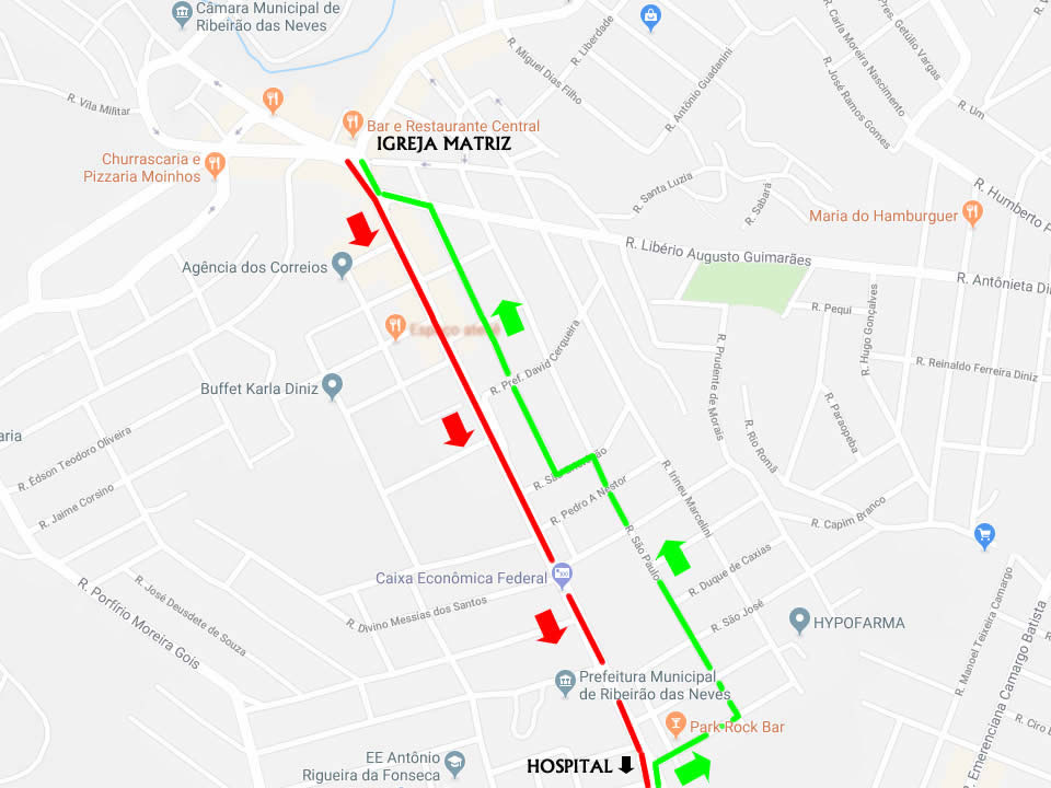 A Secretaria Municipal de Segurança, Trânsito e Transportes informa que o trajeto para quem desce sentido Praça Central e LMG 806 será o seguinte: Rua São Pedro, Rua São Paulo, Rua Maria Etelvina de Souza, Rua Libério Augusto Guimarães e Ari Teixeira da Costa ( Escola José Pedro Pereira) até a Praça Central.